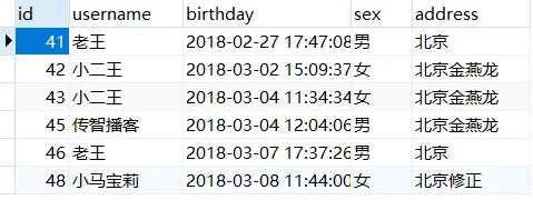 plainCREATE DATABASE Mybatis; use Mybatis; DROP TABLE IF EXISTS `user`; CREATE TABLE `user` ( `id` int(11) NOT NULL auto_increment, `username` varchar(32) NOT NULL COMMENT '用户名称', `birthday` datetime default NULL COMMENT '生日', `sex` char(1) default NULL COMMENT '性别', `address` varchar(256) default NULL COMMENT '地址', PRIMARY KEY (`id`) ) ENGINE=InnoDB DEFAULT CHARSET=utf8; insert into `user`(`id`,`username`,`birthday`,`sex`,`address`) values (41,'老王','2018-02-27 17:47:08','男','北京'),(42,'小二王','2018-03-02 15:09:37','女','北京金燕龙'),(43,'小二王','2018-03-04 11:34:34','女','北京金燕龙'),(45,'传智播客','2018-03-04 12:04:06','男','北京金燕龙'),(46,'老王','2018-03-07 17:37:26','男','北京'),(48,'小马宝莉','2018-03-08 11:44:00','女','北京修正');