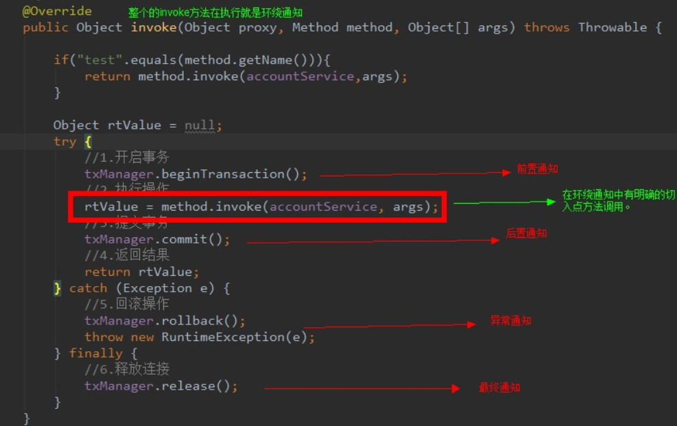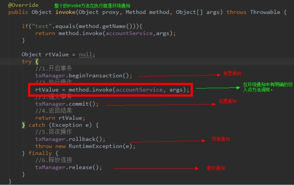 spring中可以在环绕通知中配置其他的通知- 既然上面的动态代理图片中有明确的方法调用,所以在环绕通知中也应该进行方法调用,要不然就不会进行方法执行