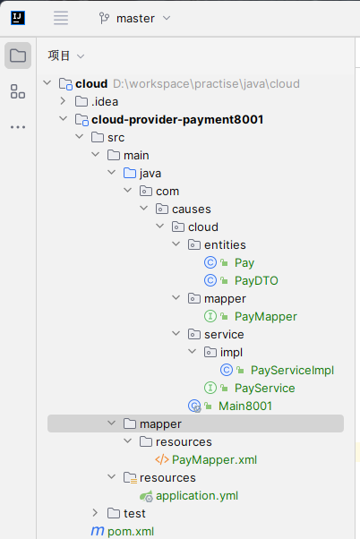 Main8001,这样以端口划分不会出错javapackage com.causes.cloud; import org.springframework.boot.SpringApplication; import org.springframework.boot.autoconfigure.SpringBootApplication; import tk.mybatis.spring.annotation.MapperScan; @SpringBootApplication /* 引入 `tk.xxx` 项目 tk:主要用于个人或者非官方项目,org 一般用于开源项目或者组织 直接在主启动类下直接扫描 mapper 下的所有内容,不用每一个都写 @Mapper 注解了 */ @MapperScan("com.causes.cloud.mapper") public class Main8001 { public static void main(String[] args) { SpringApplication.run(Main8001.class, args); } }将环境搭建中的 mapper、dao 转移到当前项目下,并且建立