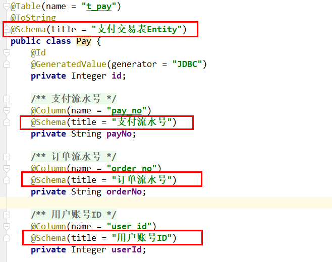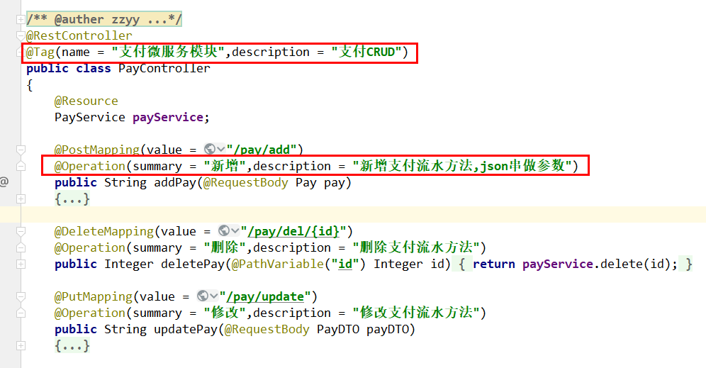 javapackage com.causes.cloud.entities; import lombok.AllArgsConstructor; import lombok.Data; import lombok.NoArgsConstructor; import java.io.Serializable; import java.math.BigDecimal; @Data @AllArgsConstructor @NoArgsConstructor public class PayDTO implements Serializable { private Integer id; //支付流水号 private String payNo; //订单流水号 private String orderNo; //用户账号ID private Integer userId; //交易金额 private BigDecimal amount; }javapackage com.causes.cloud.service; import com.causes.cloud.entities.Pay; import java.util.List; public interface PayService { int add(Pay pay); int delete(Integer id); int update(Pay pay); Pay getById(Integer id); List<Pay> getAll(); }javapackage com.causes.cloud.service.impl; import com.causes.cloud.entities.Pay; import com.causes.cloud.mapper.PayMapper; import com.causes.cloud.service.PayService; import jakarta.annotation.Resource; import org.springframework.stereotype.Service; import java.util.List; @Service public class PayServiceImpl implements PayService { // 推荐使用新包 jakarta.annotation.Resource,不要用 @Autowired 了 @Resource private PayMapper payMapper; @Override public int add(Pay pay) { return payMapper.insertSelective(pay); } @Override public int delete(Integer id) { return payMapper.deleteByPrimaryKey(id); } @Override public int update(Pay pay) { return payMapper.updateByPrimaryKeySelective(pay); } @Override public Pay getById(Integer id) { return payMapper.selectByPrimaryKey(id); } @Override public List<Pay> getAll() { return payMapper.selectAll(); } }javapackage com.causes.cloud.controller; import com.causes.cloud.entities.Pay; import com.causes.cloud.entities.PayDTO; import com.causes.cloud.service.PayService; import jakarta.annotation.Resource; import org.springframework.beans.BeanUtils; import org.springframework.web.bind.annotation.*; @RestController public class PayController { @Resource PayService payService; @PostMapping(value = "/pay/add") public String addPay(@RequestBody Pay pay) { System.out.println(pay.toString()); int i = payService.add(pay); return "成功插入记录,返回值:" + i; } @DeleteMapping(value = "/pay/del/{id}") public Integer deletePay(@PathVariable("id") Integer id) { return payService.delete(id); } @PutMapping(value = "/pay/update") public String updatePay(@RequestBody PayDTO payDTO) { Pay pay = new Pay(); BeanUtils.copyProperties(payDTO, pay); int i = payService.update(pay); return "成功修改记录,返回值:" + i; } @GetMapping(value = "/pay/get/{id}") public Pay getById(@PathVariable("id") Integer id) { return payService.getById(id); } }swagger3
