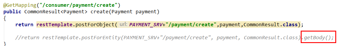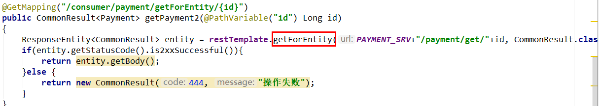 javapackage com.causes.cloud.controller; import com.causes.cloud.entity.PayDTO; import com.causes.cloud.resp.ResultData; import org.springframework.beans.factory.annotation.Autowired; import org.springframework.web.bind.annotation.GetMapping; import org.springframework.web.bind.annotation.PathVariable; import org.springframework.web.bind.annotation.RestController; import org.springframework.web.client.RestTemplate; @RestController public class OrderController { // 先写死,硬编码 public static final String PaymentSrv_URL = "http://localhost:8001"; @Autowired private RestTemplate restTemplate; /** * 一般情况下,通过浏览器的地址栏输入 url,发送的只能是 get 请求 * 我们底层调用的是 post 方法,模拟消费者发送 get 请求,客户端消费者 * 参数可以不添加 @RequestBody */ @GetMapping("/consumer/pay/add") public ResultData addOrder(PayDTO payDTO) { return restTemplate.postForObject(PaymentSrv_URL + "/pay/add", payDTO, ResultData.class); } // 删除 + 修改操作作为家庭作业 @GetMapping("/consumer/pay/get/{id}") public ResultData getPayInfo(@PathVariable("id") Integer id) { return restTemplate.getForObject(PaymentSrv_URL + "/pay/get/" + id, ResultData.class, id); } }工程重构