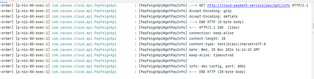causes.cloud.api.PayFeignApi是官方要求的配置logging.level + 含有@FeignClient注解的完整带包名的接口名+debug就是暴露出来的公共方法yamllogging: level: com: causes: cloud: api: PayFeignApi: debug调用接口,发现可以看到配置,其中还带有我们配置的 HTTP 压缩