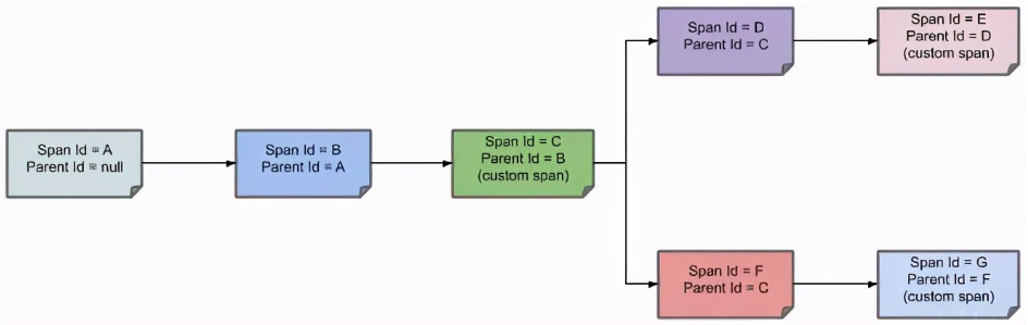 - 第一个节点:Span ID = A,Parent ID = null,Service 1 接收到请求。