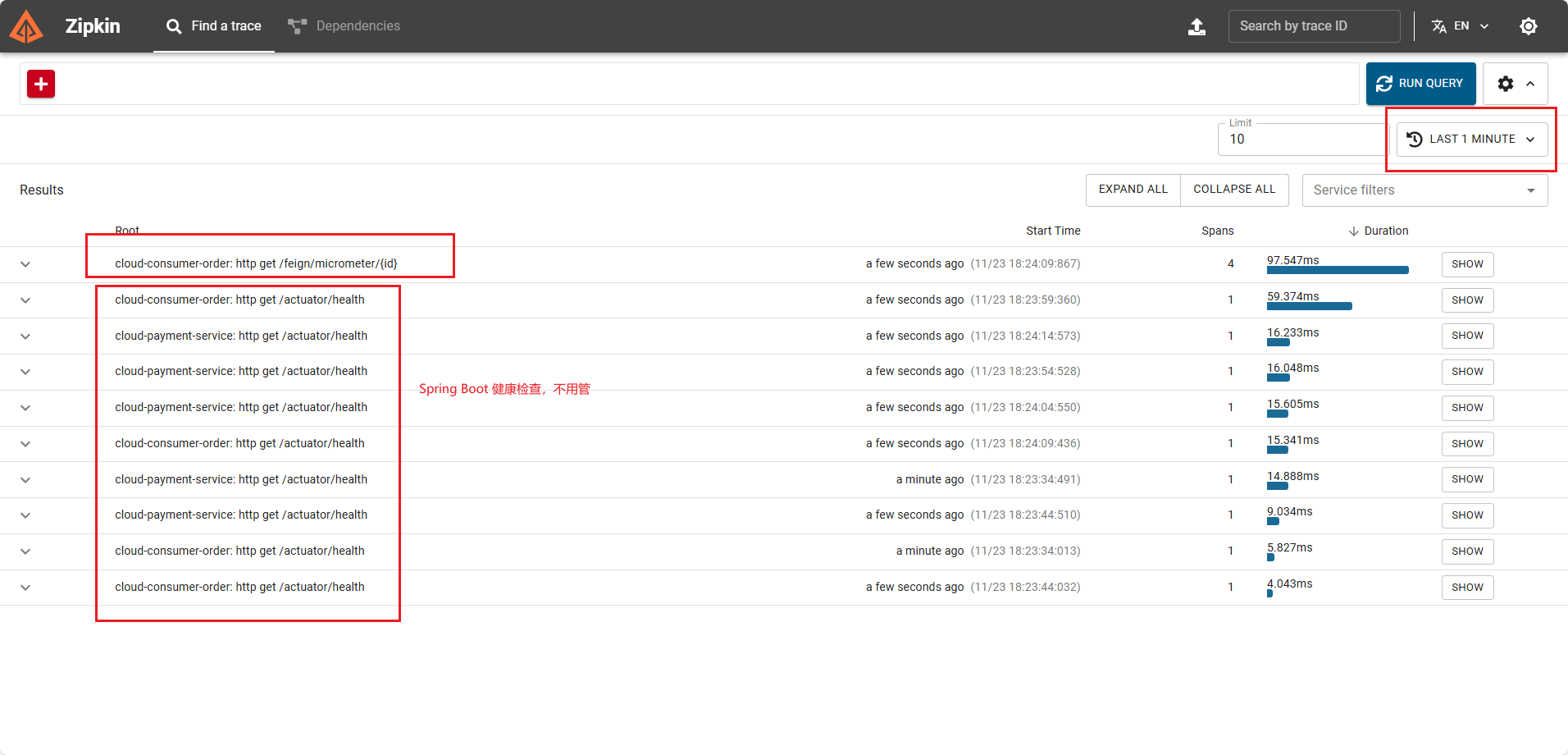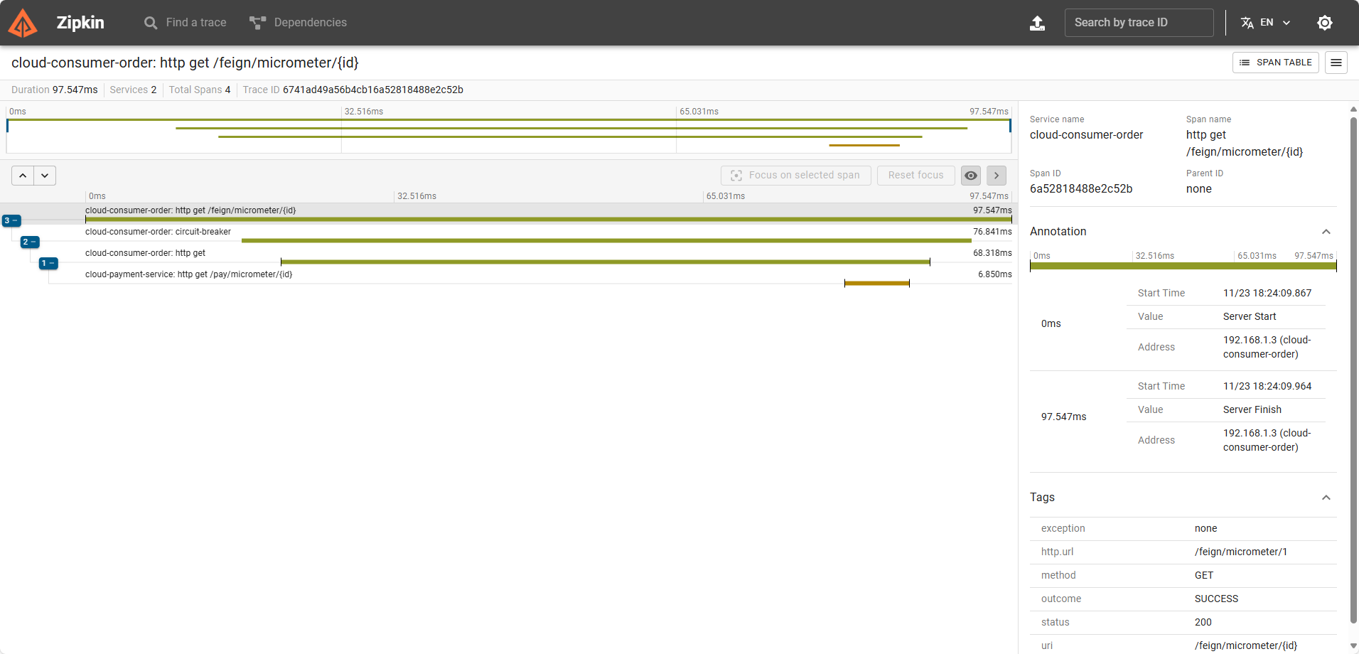 xml<!--micrometer-tracing指标追踪 1--> <dependency> <groupId>io.micrometer</groupId> <artifactId>micrometer-tracing</artifactId> </dependency> <!--micrometer-tracing-bridge-brave适配zipkin的桥接包 2--> <dependency> <groupId>io.micrometer</groupId> <artifactId>micrometer-tracing-bridge-brave</artifactId> </dependency> <!--micrometer-observation 3--> <dependency> <groupId>io.micrometer</groupId> <artifactId>micrometer-observation</artifactId> </dependency> <!--feign-micrometer 4--> <dependency> <groupId>io.github.openfeign</groupId> <artifactId>feign-micrometer</artifactId> </dependency> <!--zipkin-reporter-brave 5--> <dependency> <groupId>io.zipkin.reporter2</groupId> <artifactId>zipkin-reporter-brave</artifactId> </dependency>yaml# zipkin图形展现地址和采样率设置 management: zipkin: tracing: endpoint: http://localhost:9411/api/v2/spans tracing: sampling: probability: 1.0java@RestController @Slf4j public class OrderMicrometerController { @Resource private PayFeignApi payFeignApi; @GetMapping(value = "/feign/micrometer/{id}") public String myMicrometer(@PathVariable("id") Integer id) { return payFeignApi.myMicrometer(id); } }调用接口