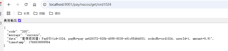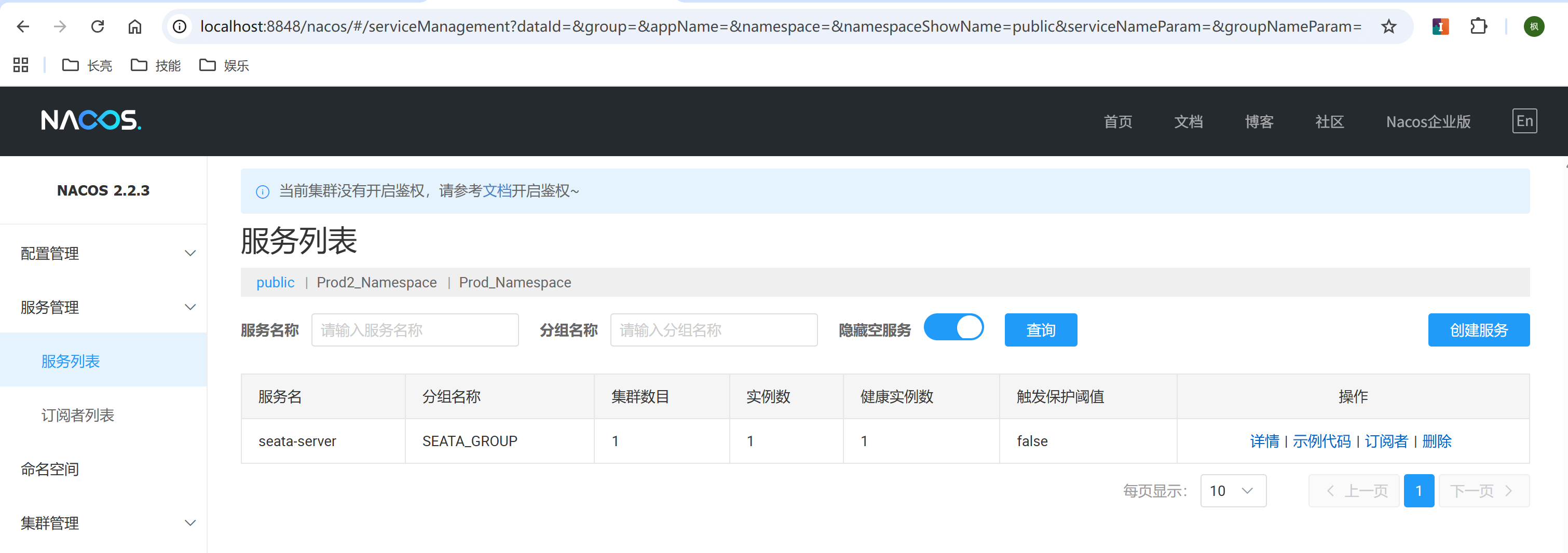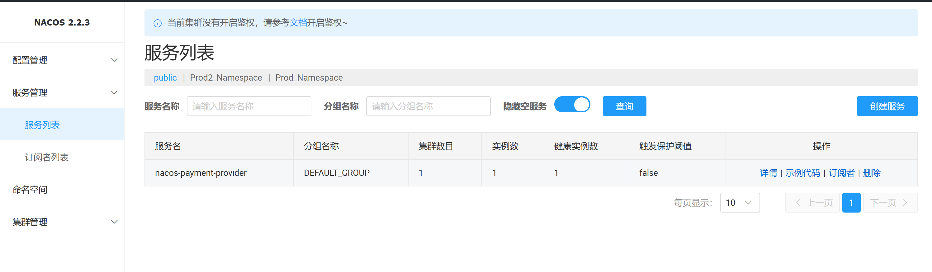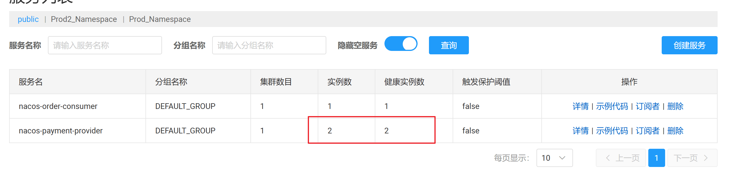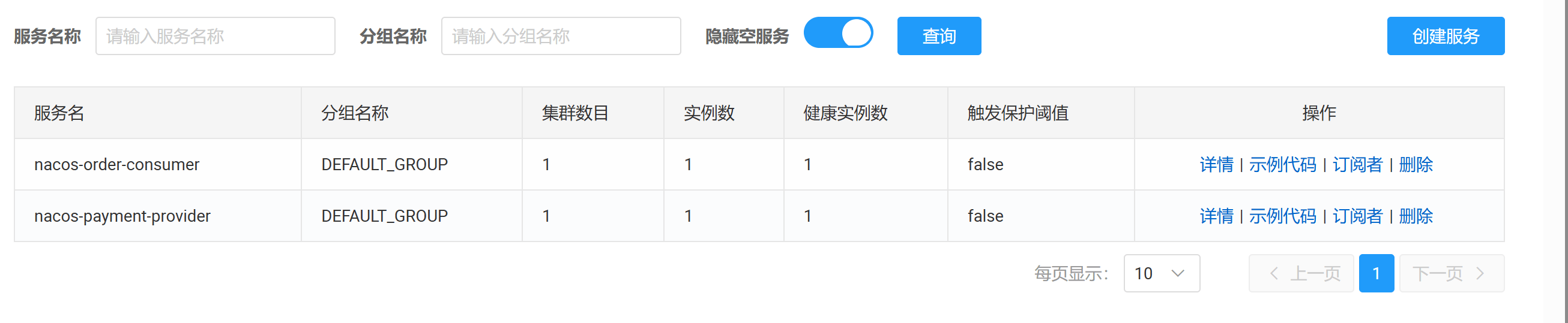 java@RestController public class PayAlibabaController { @Value("${server.port}") private String serverPort; @GetMapping(value = "/pay/nacos/{id}") public String getPayInfo(@PathVariable("id") Integer id) { return "nacos registry, serverPort: "+ serverPort+"\t id"+id; } }启动,查看 nacos 服务注册情况