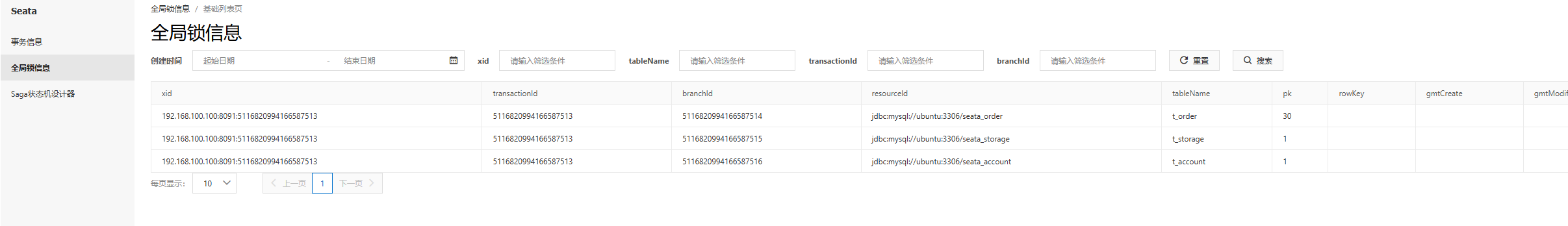 http://localhost:2001/order/create?userId=1&productId=1&count=10&money=100会看到对应的数据库信息,然后加上时间等待和抛出异常,在 seata 后台会看到锁
