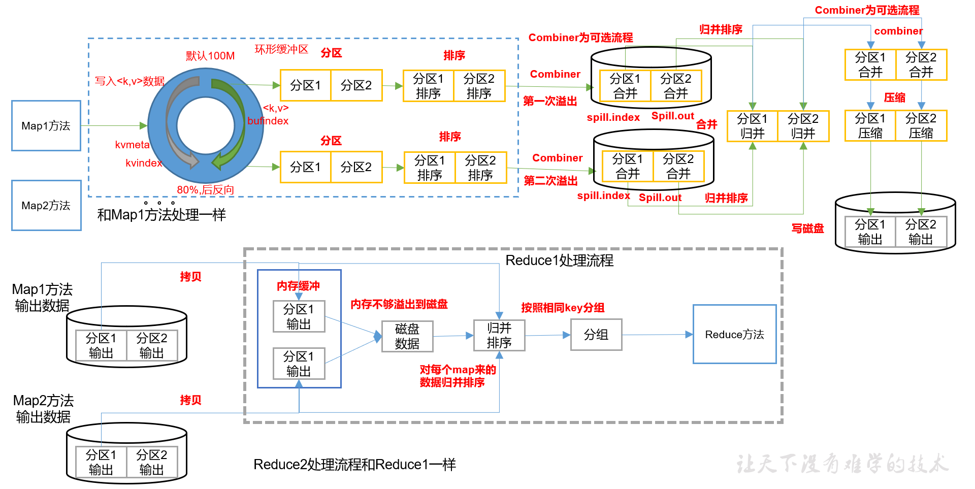 在 map 方法之后,reduce 之前的数据处理过程称为 Shuffle,也就是从环形缓冲区到 Combiner 的位置。