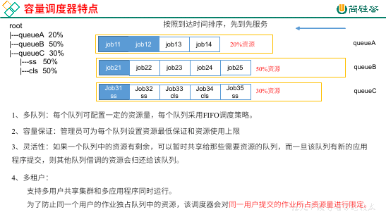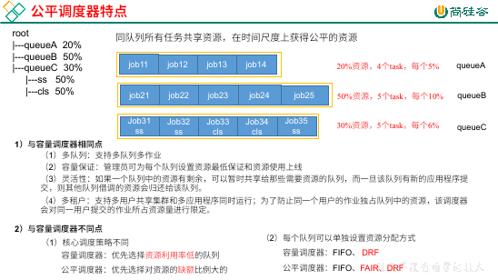- 支持多用户和多应用执行。该调度器会对单个用户提交的作业所占资源量进行限制。