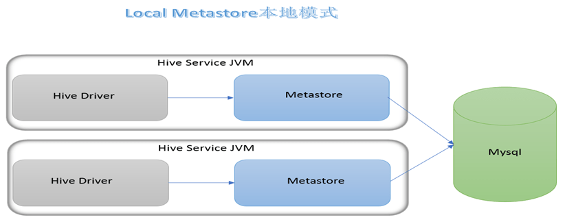 本地模式下,外部数据库存储元数据,但是 metastore 也不需要单独配置,比内嵌模式好些,支持多个用户,但是问题是每次启动一次 hive 服务,都内置启动一个 metastore 服务。