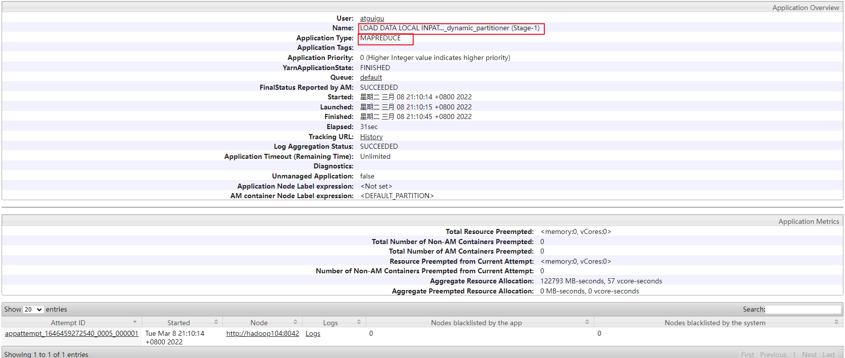 LOAD DATA LOCAL INPATH '/tmp/students' INTO TABLE student_dynamic_partitioner;从时间上看,明显边长了,并且经历了一次 MapReduce:
