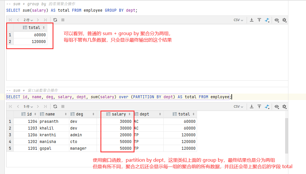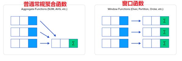 窗口聚合函数不会隐藏聚合中的各个行(可以访问当中的各个行),并且可以将这些行的属性添加到结果集中。