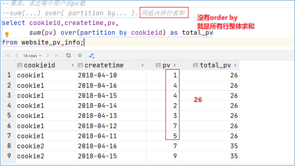 SELECT cookieId, sum(pv) over(PARTITION BY cookieId) AS total_pv FROM website_pv_info;