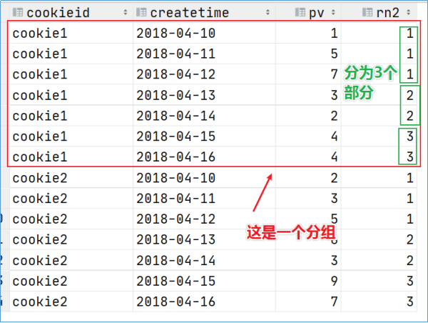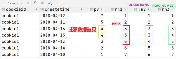 dense_rank() over (PARTITION BY cookieId ORDER BY pv DESC) AS rn2,