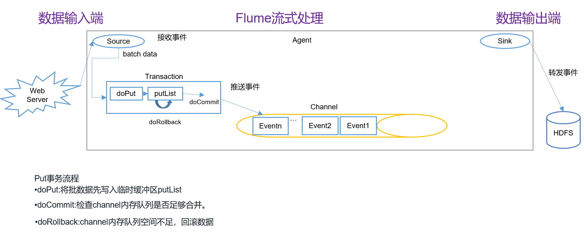 从 source -> channel 的过程需要用到事务,我们叫做 put 事务。