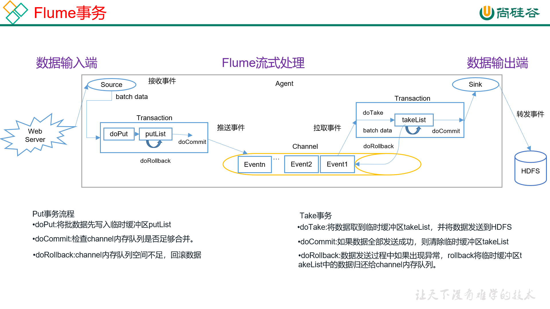 那么从 Source -> Channel 的过程中,需要进行传输,就要使用到事务。Channel -> Sink 的时候,也必须要用到事务。