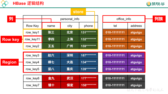 为了解决文件太大的困扰,HBase 会横向切分表,每一块就是一个 Region,而每一个 Region 根据列族进行纵向切分,形成的就是 Store。