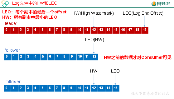 每个副本中最后一个 offset 叫做 LEO(Log End Offset),所有副本中最小的 LEO 叫做 HW(High Watermark)。