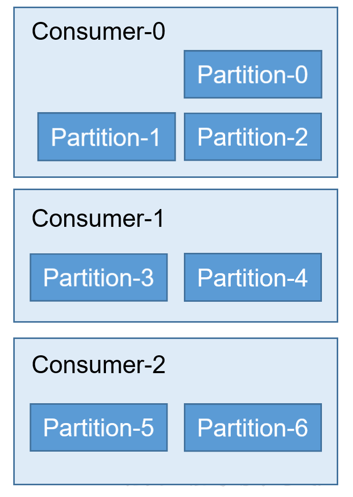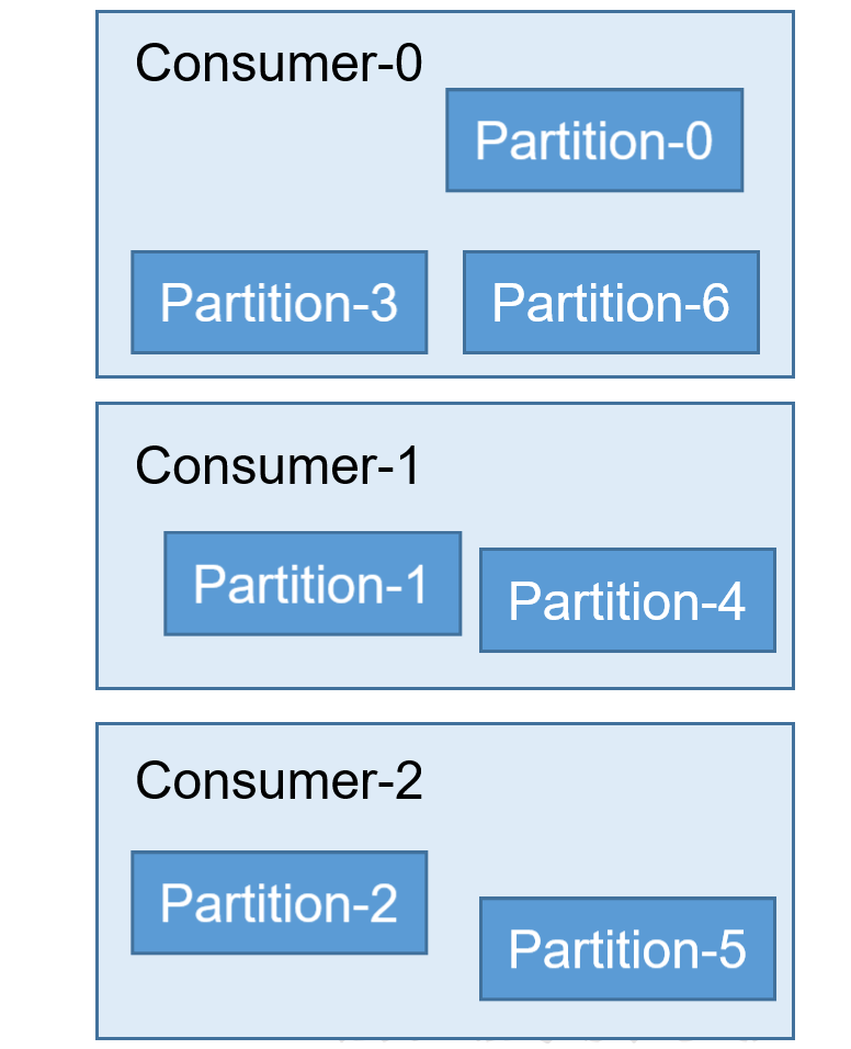 轮询,现在有一个消费者组中的三个消费者,一个 topic 中的七个 partition