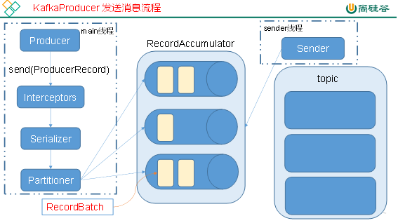 Kafka 的生产者可以同步发送消息,也可以异步发送消息,主要涉及到了两个线程:main、sender,涉及到了一个线程共享变量:RecordAccumulator。