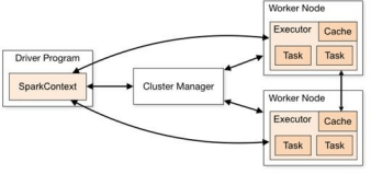其中 Driver 就是 master,负责任务调度;Executor 是 slave,负责任务的实际执行。下图的 Cluster Manager 的主要作用就是启动 Executor,之后 Executor 就与 Driver 直接通信了。