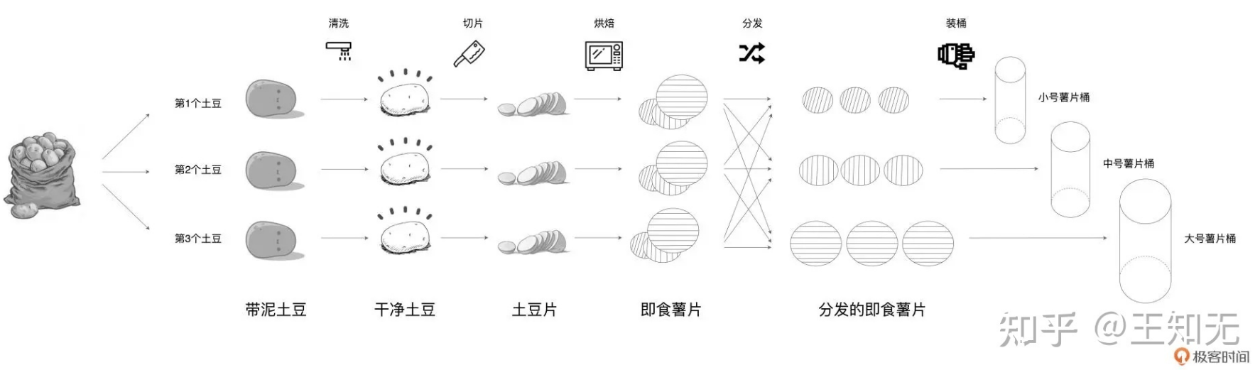 使用文字的方式确实比较抽象了,所以在这里先行一个概述,有人使用薯片的加工流程做了比喻。