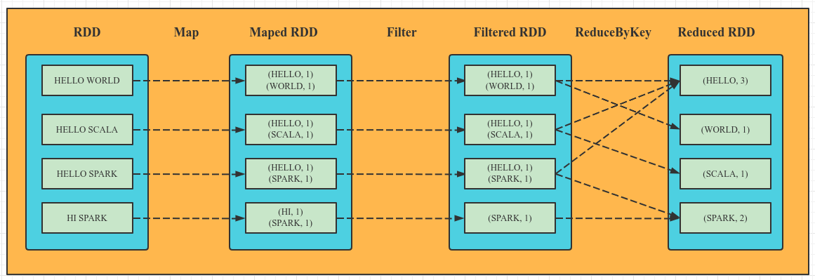 val rdd = sc.makeRDD(List("HELLO WORLD", "HELLO SPARK", "HELLO SCALA"))
