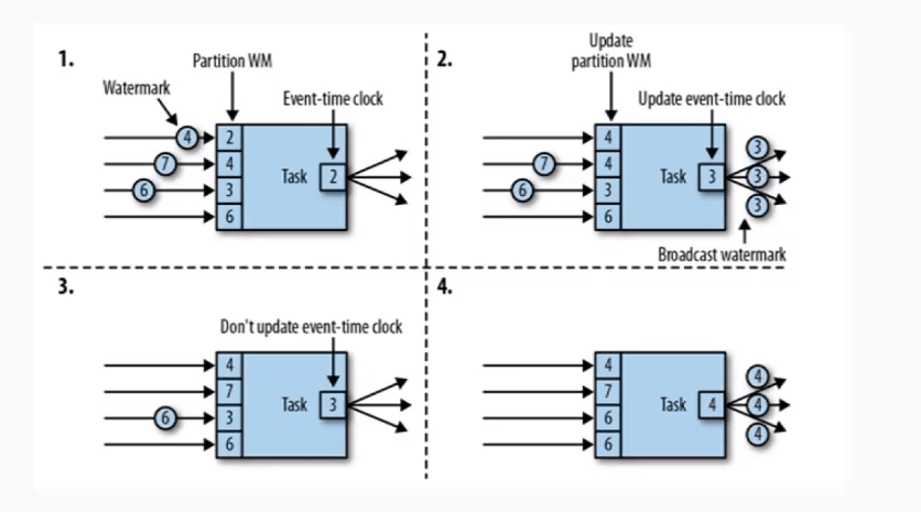 因为上游的并行任务可能会传递多个水位线到下游,所以上游的水位线会专门保存到一个分区中。下游检测的话,会以分区中的最小的水位线为主。