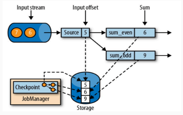 那么这表示算子已经处理完了 1、2、3、4、5,也就是 sum_event 已经处理了 2 + 4,sum_odd 已经处理了 1 + 3 + 5,并且对于 kafka 来讲,数据源 source 刚刚消费完偏移量为 5 的数据。
