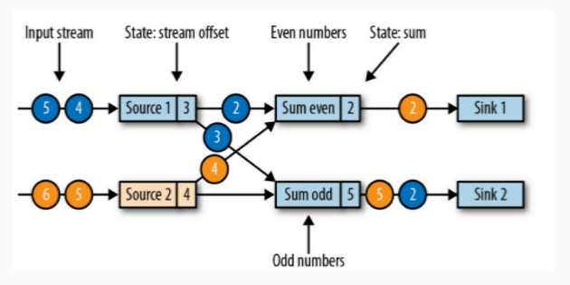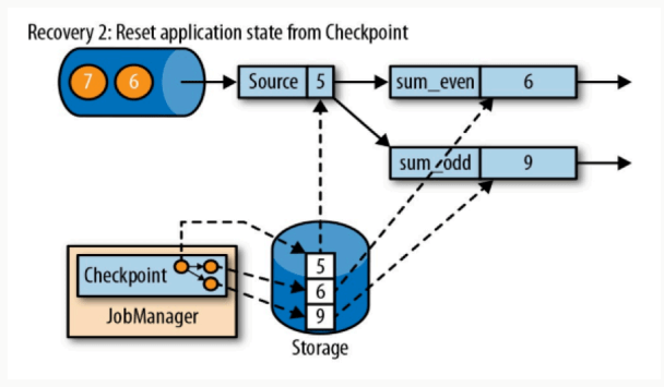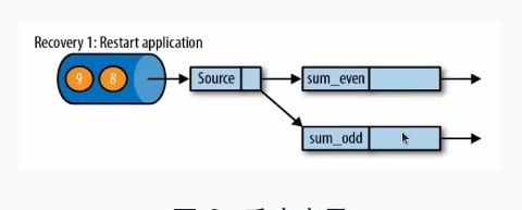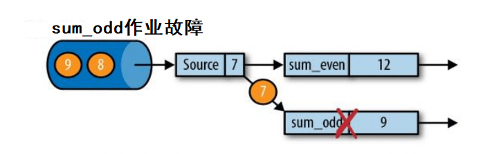 此时一个算子发生了故障,看到上图中,算子 sum_odd 挂了,那么就需要从检查点恢复数据了。