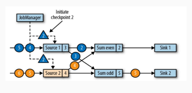 JobManager 会向每一个 Source 算子发送一个检查点的事件,检查点事件 ID 应该都是相同的(比如说检查点事件 ID 为 2),也就是下图中三角形的事件。