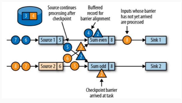 当第一个 source 算子的检查点事件到达之后,此算子就会停止计算,继续等待其他的检查点事件算子到达(也就是上图中,属于 source2 的黄色的检查点和属于 source1 蓝色的检查点都到达)。