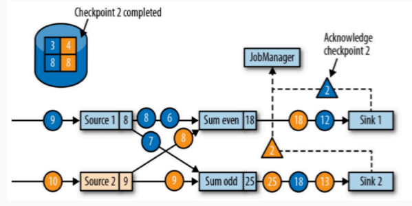 source 算子是两个,那么保存完成检查点之后,每一个 sum 算子都会复制一份自己的得到的分界线事件并广播到下游中,所以每一个下游的算子都会得到上游的每个 source 算子的检查点事件。