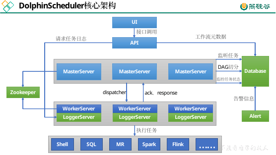 - MasterServer:分布式无中心设计理念,负责 DAG 任务切分、任务提交、任务监控,监听其他 MasterServer 和 WorkerServer 的健康状态。
