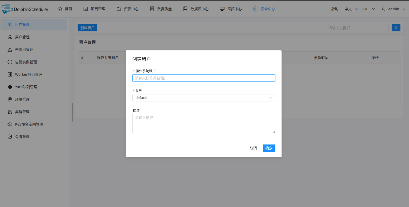 worker.properties中worker.tenant.auto.create=true,令没有这个租户会创建。worker.tenant.auto.create=true会要求 worker 免密运行 sudo。