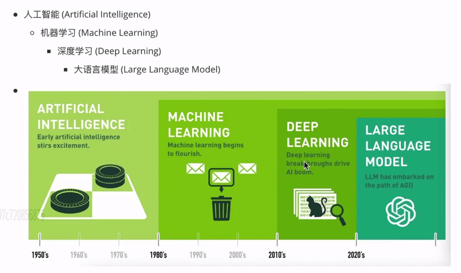 人工智能关键词, 以下人工智能关键词为包含关系, 其中人工智能为最广义概念, 最精细的成果目前为大语言模型。