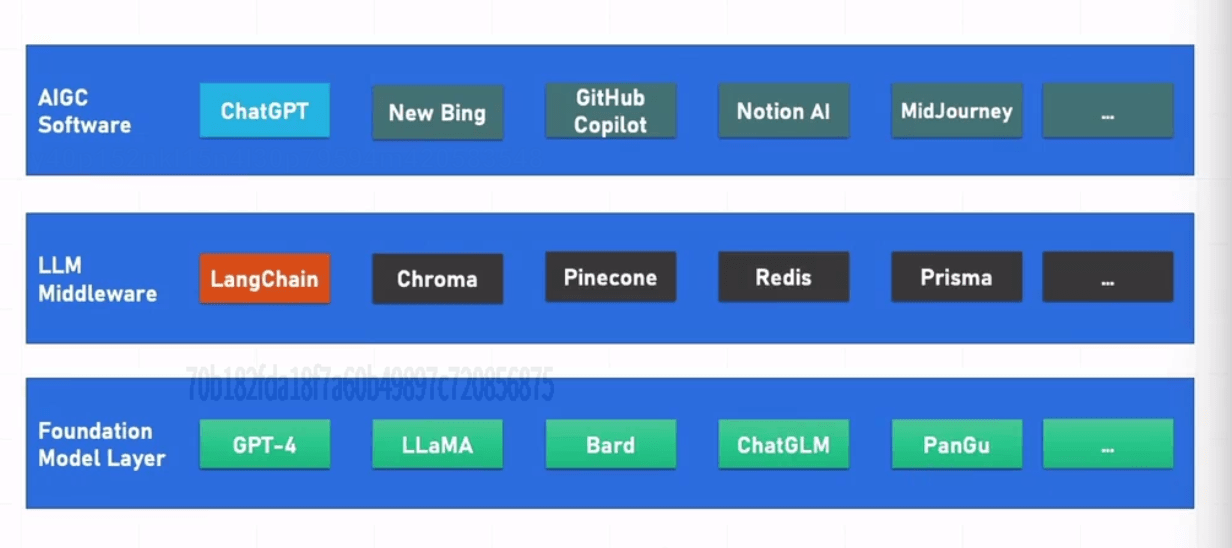 底层 --> LLM 中间层 --> AIGC 软件层产品