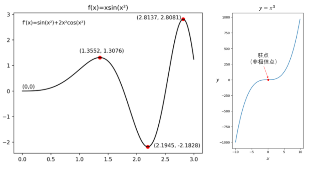 对于导数等于 0 的点来说(驻点), 可能会取值为极大值或者极小值, 也可能都不是, 进一步判断驻点类型则需要查看导数在附近的符号