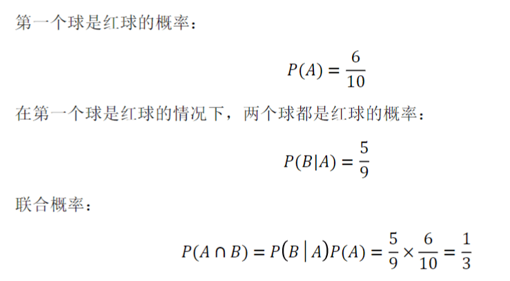 现有一个装有 10 个球的袋子, 其中有 6 个红球和 4 个蓝球。从中随机抽取两个球。我们定义以下事件: