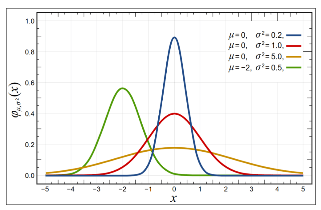 意思就是说, 代表的是一个所有的随机取值的一个平均值, 代表的是一个所有的随机取值的一个方差, 方差的大小决定了最后的概率是集中在平均值周围还是分散平均值之外