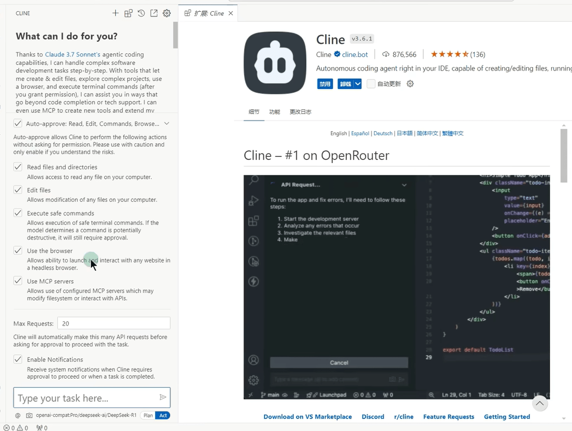 Cline 是 vscode 的插件,可以调用 LLM 进行代码自动开发