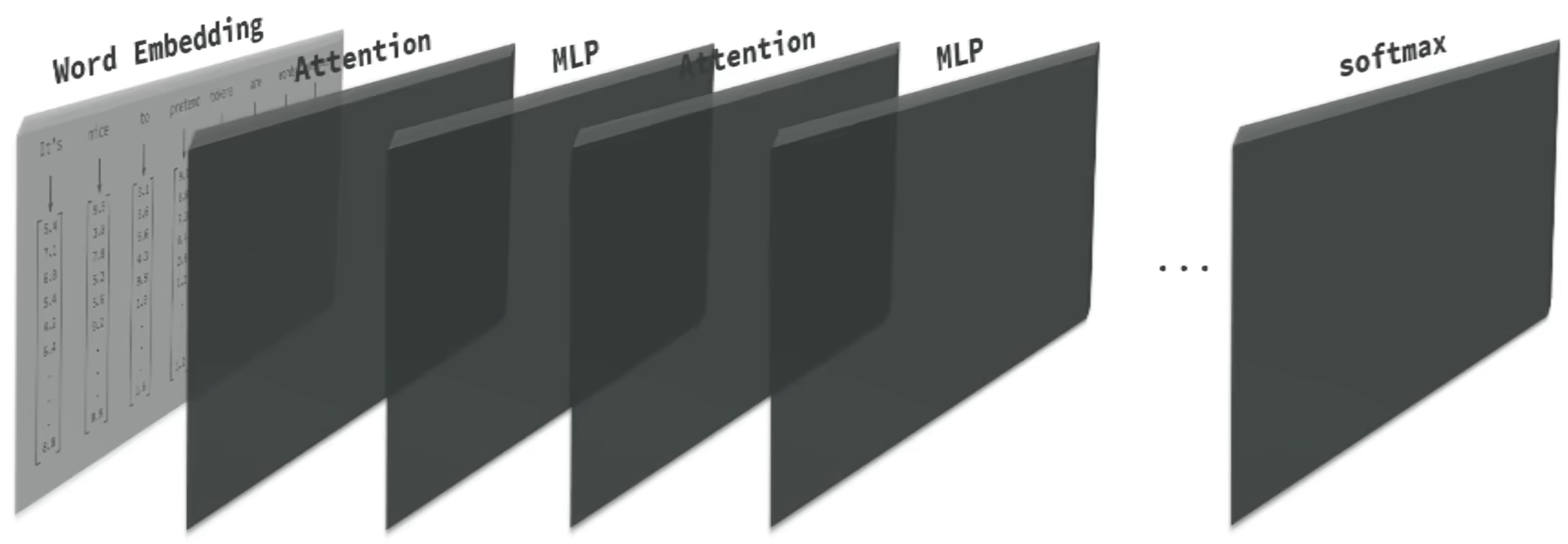 那么 token 已经转为了向量,之后就是多次的 Attention(根据上下文对向量进一步调整)、MLP(多层感知机,基于分析进行进一步分析推理)