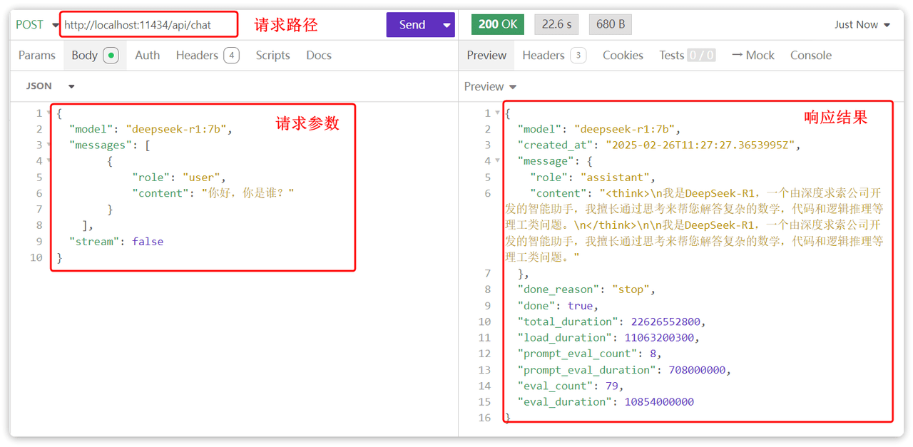 ollama help # Help about any command在启动模型之后,本地接口为 http://localhost:11434/api/chat,可以根据请求参数调用使用